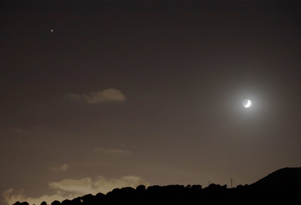 Estas fotos fueron tomadas la noche del miércoles, 2 de octubre de 2019, desde Arenys de Munt, Barcelona, España. Se puede ver a la Luna creciente, la estrella Antares (zona central-inferior) y Júpiter (zona superior-izquierda).