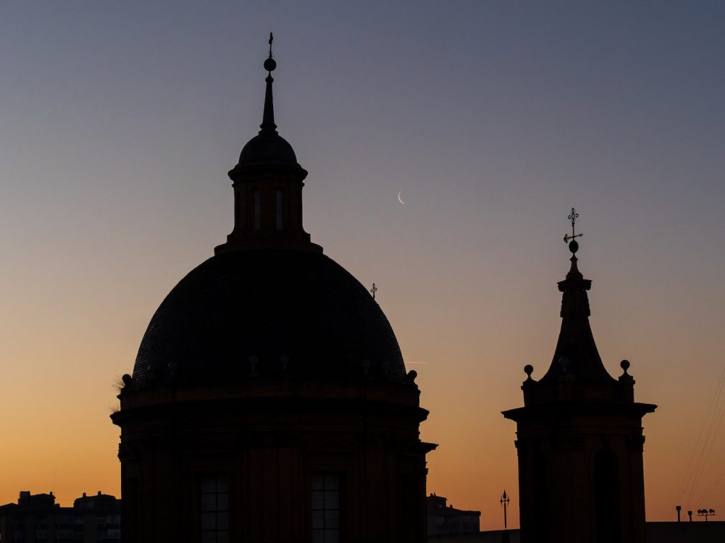 Imágenes de la Luna menguante captadas la mañana del jueves, 20 de febrero de 2020, desde la ciudad de Zaragoza, España. Se pueden apreciar las cúpulas de la Iglesia de San Fernando.
