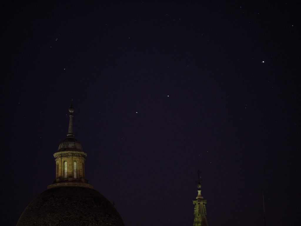 La primera foto se tomó alrededor de las 23:00 (hora local); la segunda a las 07:00 (hora local). La tercera foto muestra a los planetas Saturno y Júpiter.
