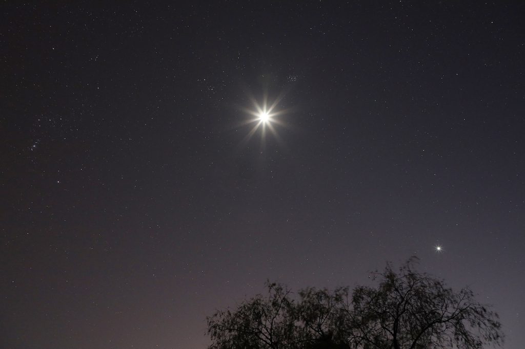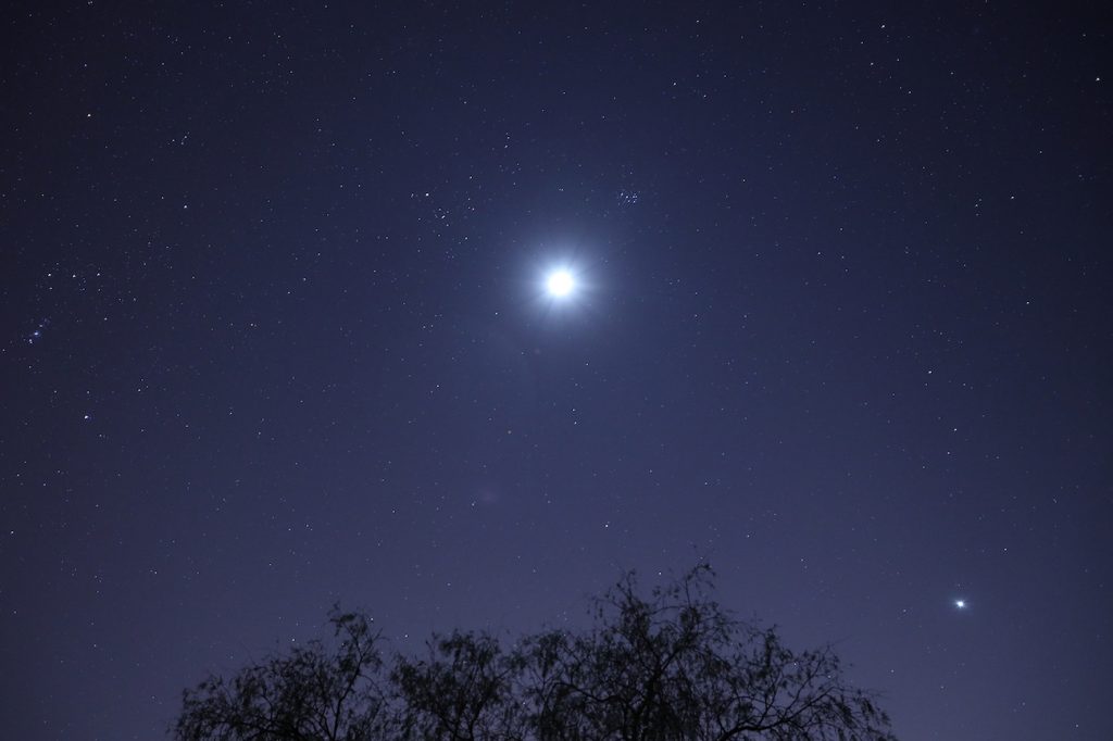 La segunda foto muestra a la Luna con las Pléyades y la estrella Aldebarán. Fue captada a las 19:50 (hora local) con una cámara Canon EOS R; tiene 15 segundos de tiempo de exposición, 3200 de ISO y f/8 de apertura.