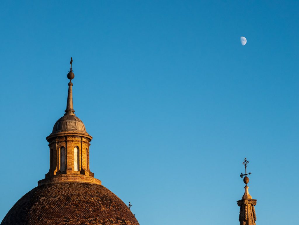 Fotografías de la Luna tomadas la tarde del lunes, 7 de octubre de 2019, desde la ciudad de Zaragoza, España. En primer plano se aprecia la cúpula de la Iglesia de San Fernando. Las dos capturas se obtuvieron con una cámara Panasonic Lumix GX80 y un objetivo Panasonic Lumix (45-175mm).