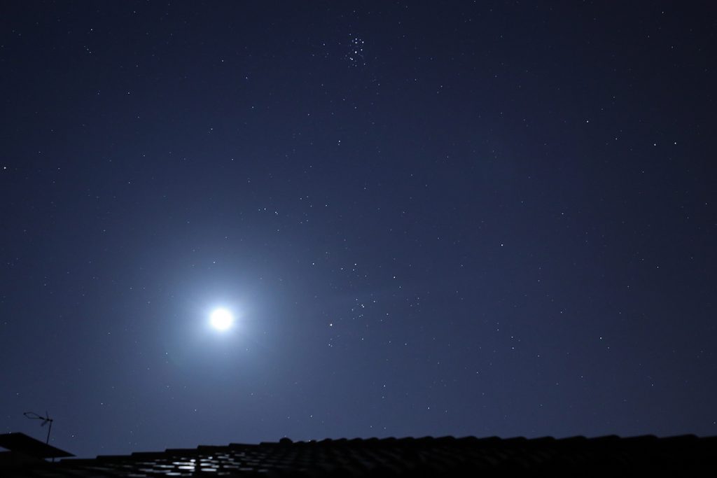 En la cuarta foto se puede ver a la Luna, Aldebarán y las Pléyades. Se tomó a las 01:56 (hora local) con una cámara Canon EOS R; tiene 3200 de ISO, f/4 de apertura y 5 segundos de tiempo de exposición.