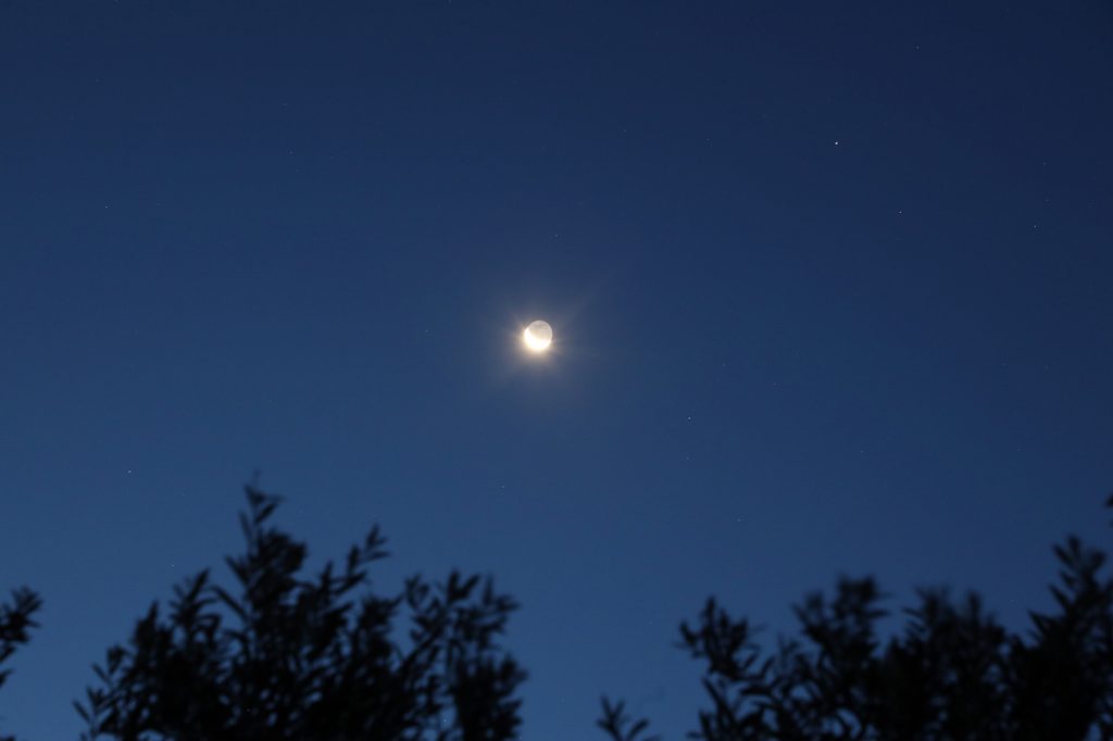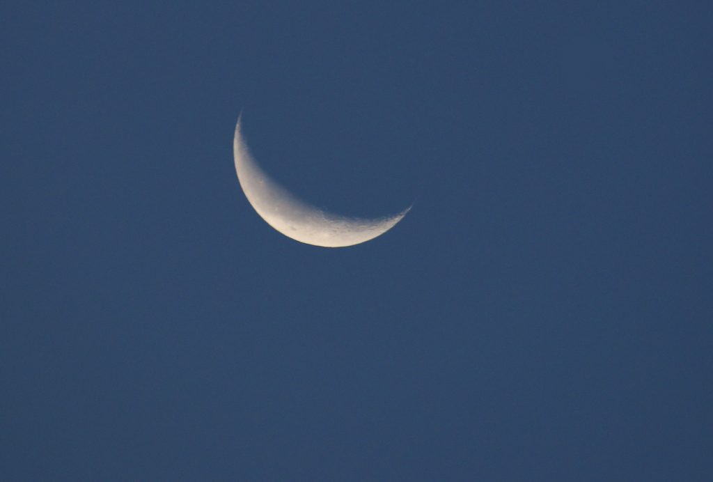 La primera foto muestra a la Luna menguante a las 08:14 (hora local); se tomó con una cámara Canon EOS 70D. Tiene un tiempo de exposición de 1/250 de segundo,400 de ISO y f/7,1 de apertura.