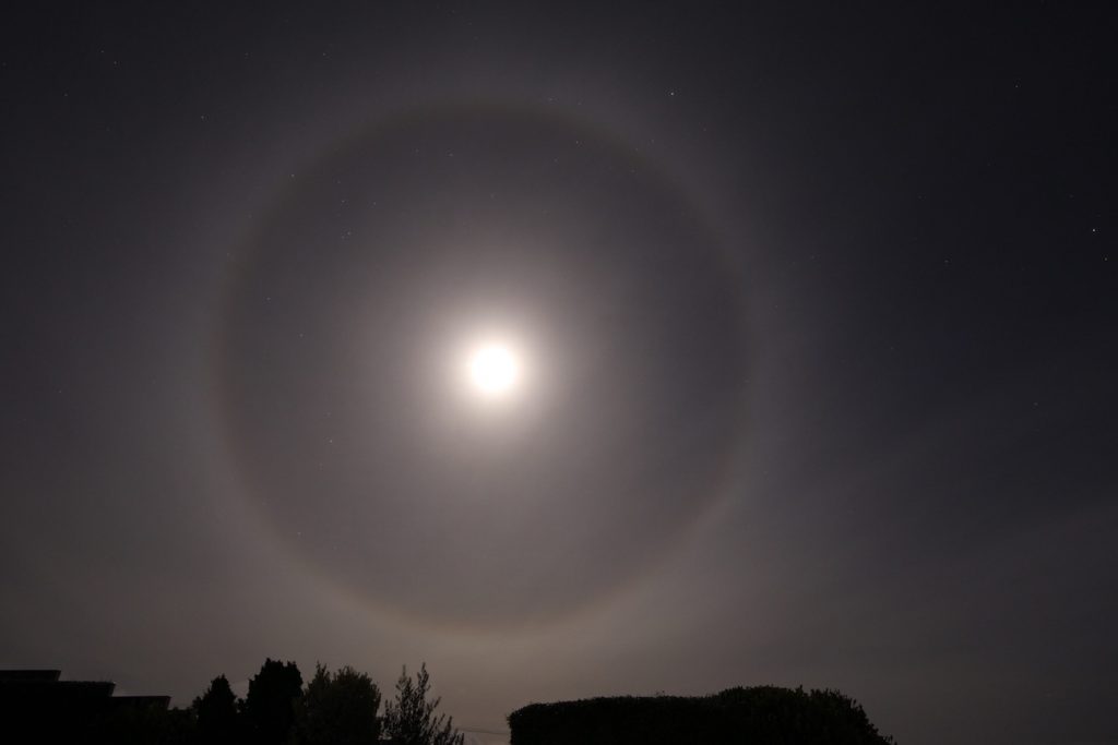 Fotografía de un halo lunar captado la madrugada del martes, 21 de mayo de 2019, desde Tasmania, Australia. Júpiter se encuentra a la izquierda de la Luna, apenas visible por el tiempo de exposición. La imagen fue hecha con una cámara Canon EOS 6D; tiene un tiempo de exposición de 8 segundos y 400 de ISO.
