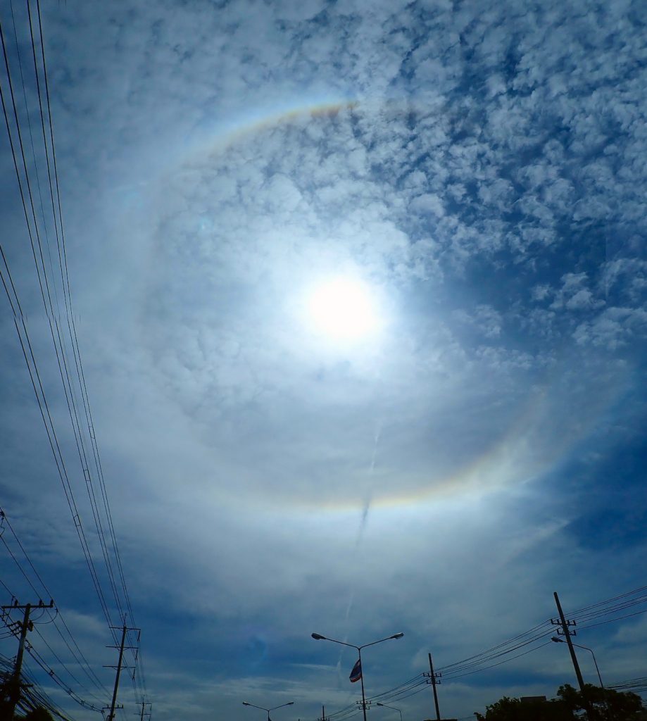 Halo solar fotografiado la mañana del 12 de septiembre de 2019, desde Ban Khlong Si, Tailandia. La foto tiene un tiempo de exposición de 1/1200 de segundo, 100 de ISO y f/7 de apertura. Se utilizó una cámara Canon EOS 500D.