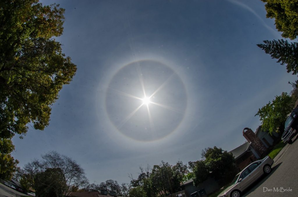 Halo solar fotografiado la mañana del domingo, 24 de marzo de 2019, desde Fair Oaks en el estado de California, Estados Unidos. Se utilizó una cámara Canon EOS 6D y un objetivo ojo de pez. El tiempo de exposición es de 1/500 de segundo, 100 de ISO y f/22 de apertura.