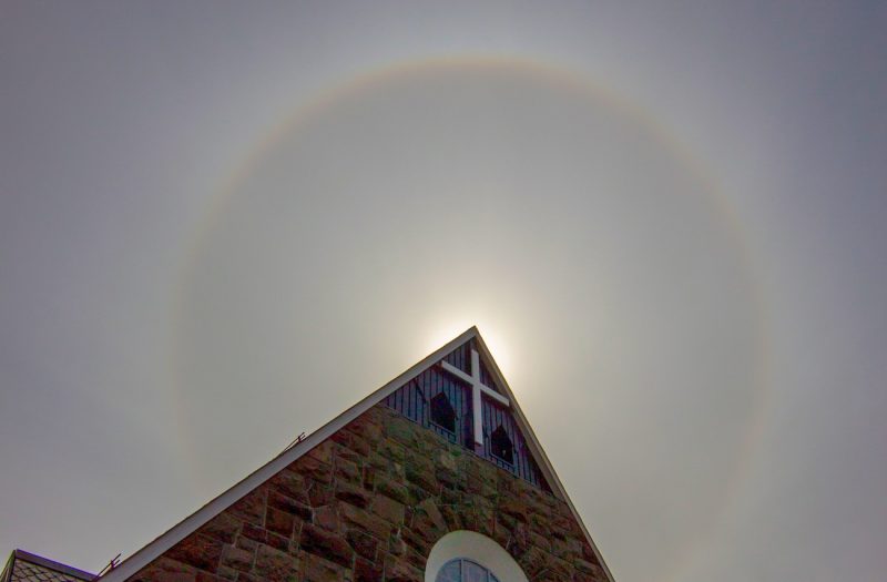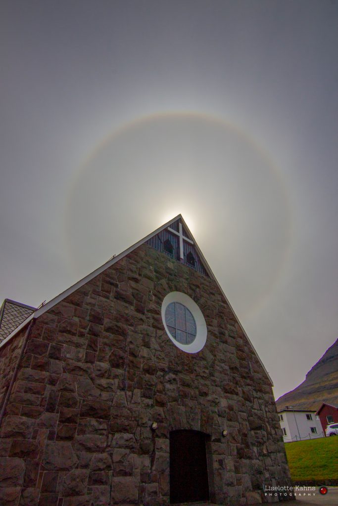 Fotografía de un halo solar tomada la mañana del sábado, 18 de mayo de 2019, desde Klaksvik, Islas Feroe. La foto tiene un tiempo de exposición de 1/1200 de segundo y 100 de ISO; se utilizó una cámara Canon IXUS 132.