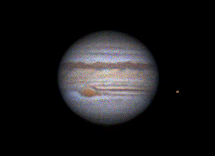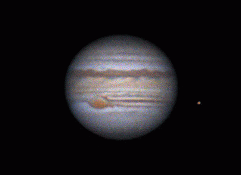 Imagen GIF del planeta Júpiter tomada la madrugada del domingo, 2 de junio de 2019, desde la ciudad de Sacramento, California, Estados Unidos. A la derecha de Júpiter se puede ver al satélite Ío. La animación GIF está compuesta por 10 capturas tomadas con una cámara ASI 224MC y un telescopio Celestron C9.25.