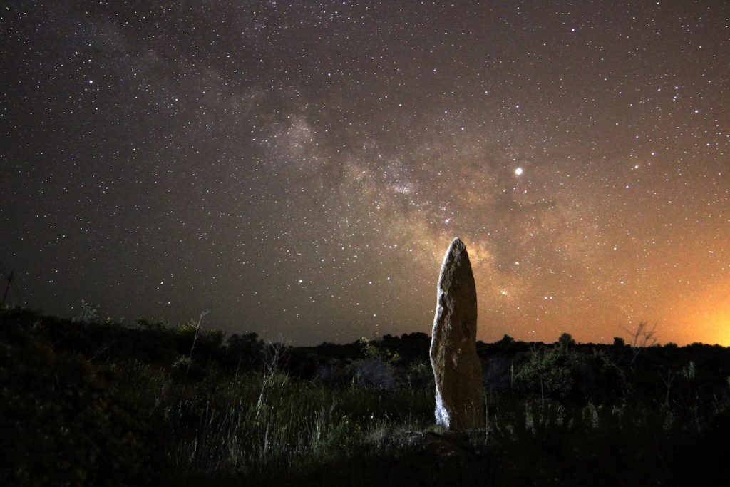 Imagen de la Vía Láctea tomada la madrugada del lunes, 27 de mayo de 2019, desde Roses, Girona, España. El planeta Júpiter es visible en la zona central-derecha; el Menhir del mas Mares es visible en primer plano.