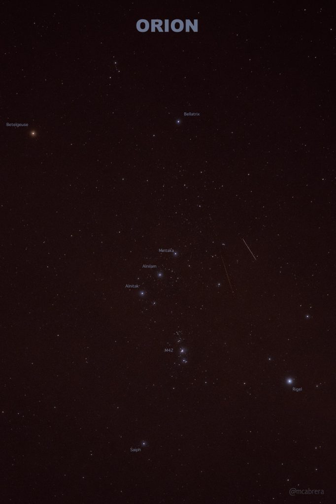 Imagen de la constelación de Orión tomada la madrugada del jueves, 10 de octubre de 2019, desde Tenerife, España (06:23 – hora local). Se utilizó una cámara Nikon D850 y un objetivo Sigma a 56mm de distancia focal. La imagen tiene un tiempo de exposición de 3 segundos, 1250 de ISO y f/8 de apertura.