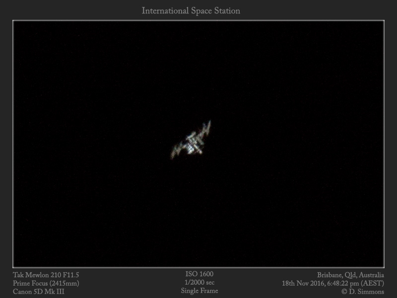 Imagen de la Estación Espacial Internacional tomada el 18 de noviembre de 2016 (18:48 – hora local) desde Brisbane, Queensland, Australia. La imagen tiene un tiempo de exposición de 1/2000 segundos y 1600 de ISO; se utilizó un telescopio refractor Tak Mewlon 210 y una cámara Canon EOS 5D Mark III.