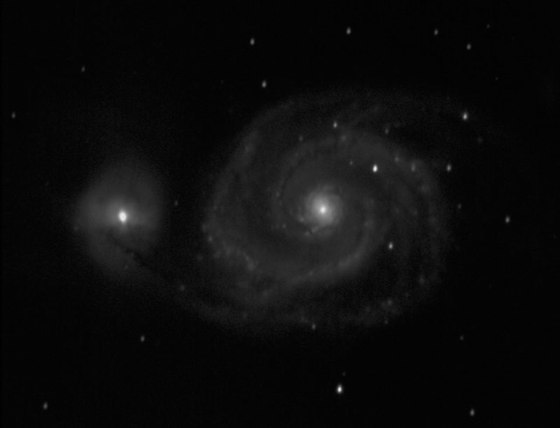 Imagen de la Galaxia Remolino (Messier 51 o M51) tomada a las 00:00 horas del 30 de abril de 2018, desde Sant Vicenç dels Horts, Barcelona, España. La imagene está compuesta de 17 capturas de 1 minuto de tiempo de exposición. Se utilizó una cámara ZWO ASI120MM (sin filtros ni autoguiado).