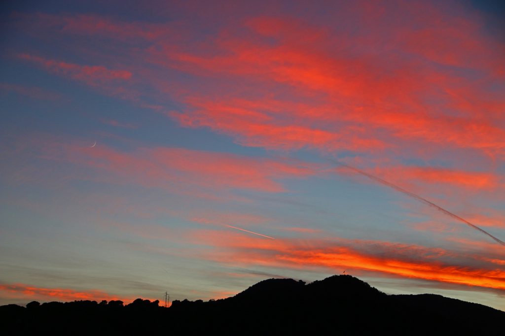 Imagen del atardecer tomada el domingo, 9 de diciembre de 2018, desde Arenys de Munt, Barcelona, España (17:35 – hora local). La Luna creciente es visible en la zona izquierda. Se utilizó una cámara Canon EOS 70D a 1/125 de segundo de tiempo de exposición, 200 de ISO y f/5,0 de apertura.