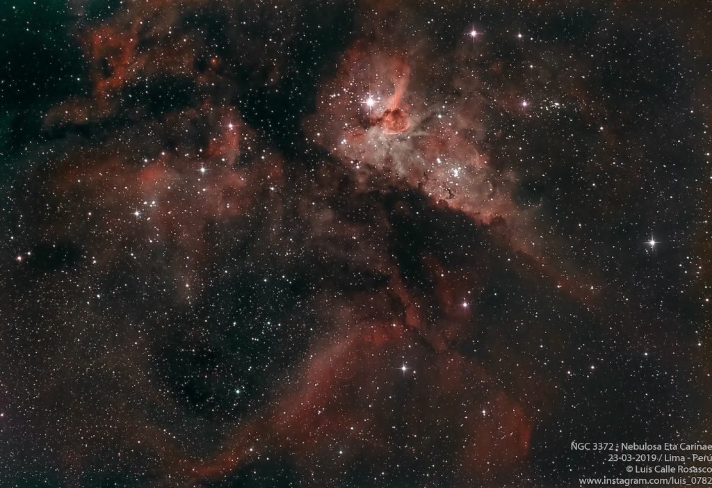 Excelente imagen de la Nebulosa Eta Carinae (también conocida como Nebulosa de Carina o NGC 3372). Fue tomada desde la ciudad de Lima, Perú. El tiempo de exposición total de la imagen es de 1 hora y 26 minutos: 14 capturas de 60 segundos; 37 capturas de 45 segundos y 60 capturas de 45 segundos.