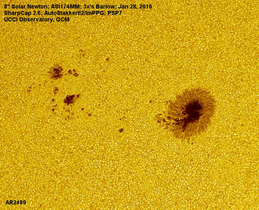Esta fotografía fue tomada el pasado 28 de enero de 2016 desde las islas Caimán. Se pueden ver las distintas manchas solares que componen a la región activa 2489 en el Sol, la cual es fácilmente visible a través de telescopios solares. Se utilizó un telescopio newtoniano solar DIY 8.