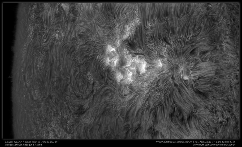 Imagen de la región activa 2661 tomada en la línea de emisión H-alfa el sábado, 3 de junio de 2017, desde Austria. Actualmente esta región activa es visible cerca del centro del disco solar. La captura se obtuvo con un telescopio Istar (9 pulgadas), una cámara ASI174MM y un filtro solar Baader.
