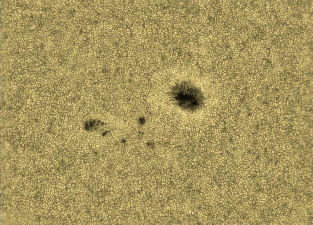 Esta imagen muestra las manchas solares de la región activa 2689 (actualmente la única región visible desde la Tierra). La imagen fue tomada el domingo, 26 de noviembre de 2017, desde Payson en Arizona, Estados Unidos. Se utilizó una cámara DMK51 acoplada a un telescopio refractor con un filtro solar Baader continuum.
