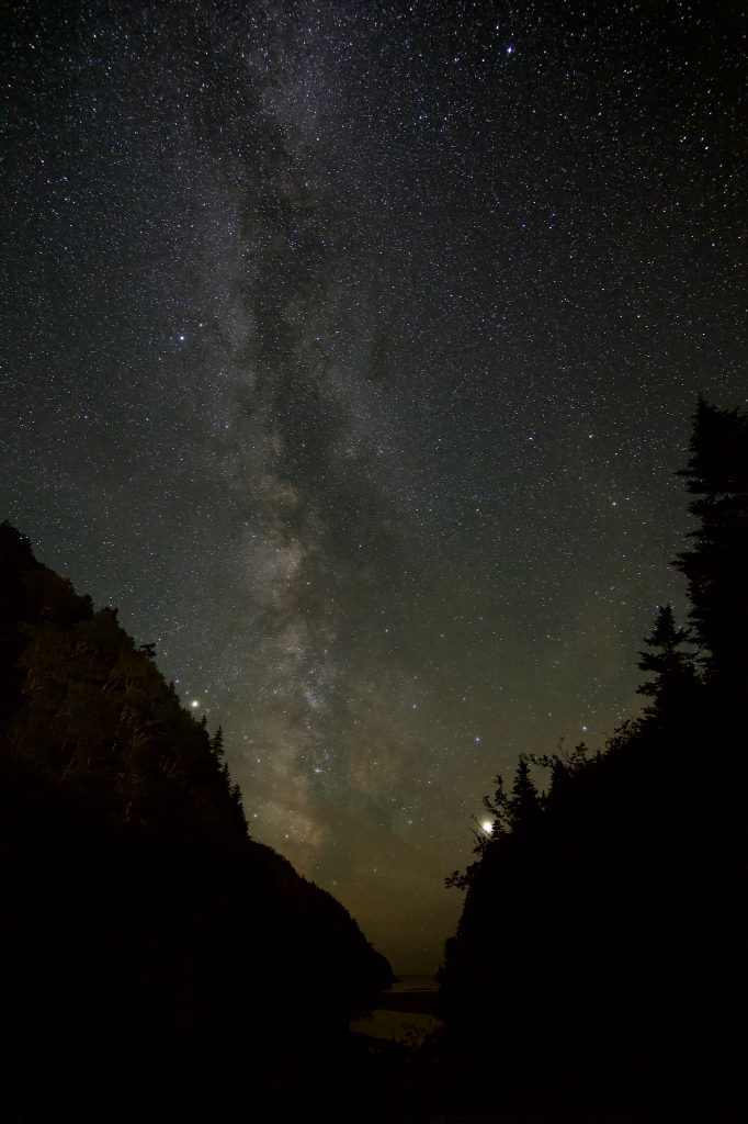 Imagen de la Vía Láctea tomada la madrugada del 31 de agosto de 2019, desde el Parque Nacional Point Wolfe en Nuevo Brunswick, Canadá. A cada lado de la Vía Láctea se pueden ver los planetas Saturno (izquierda) y Júpiter (derecha). El tiempo de exposición de la foto es de 20 segundos, tiene 3200 de ISO y f/2,8 de apertura. Se utilizó una cámara Nikon D850.