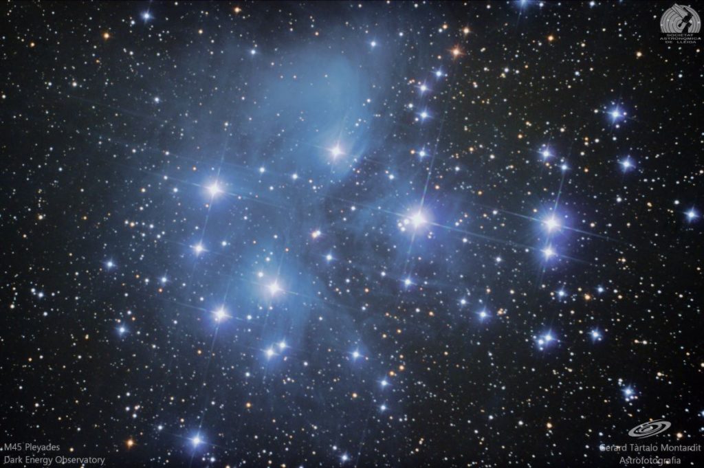 Las Pleyades, también llamadas las 7 hermanas o las 7 cabritas, es un cúmulo estelar abierto en la constelación de Tauro, muy reconocible en el cielo nocturno a simple vista, compuesto por estrellas jóvenes y calientes, de tipo B, cercanas a la Tierra, se encuentra a 444 años luz.