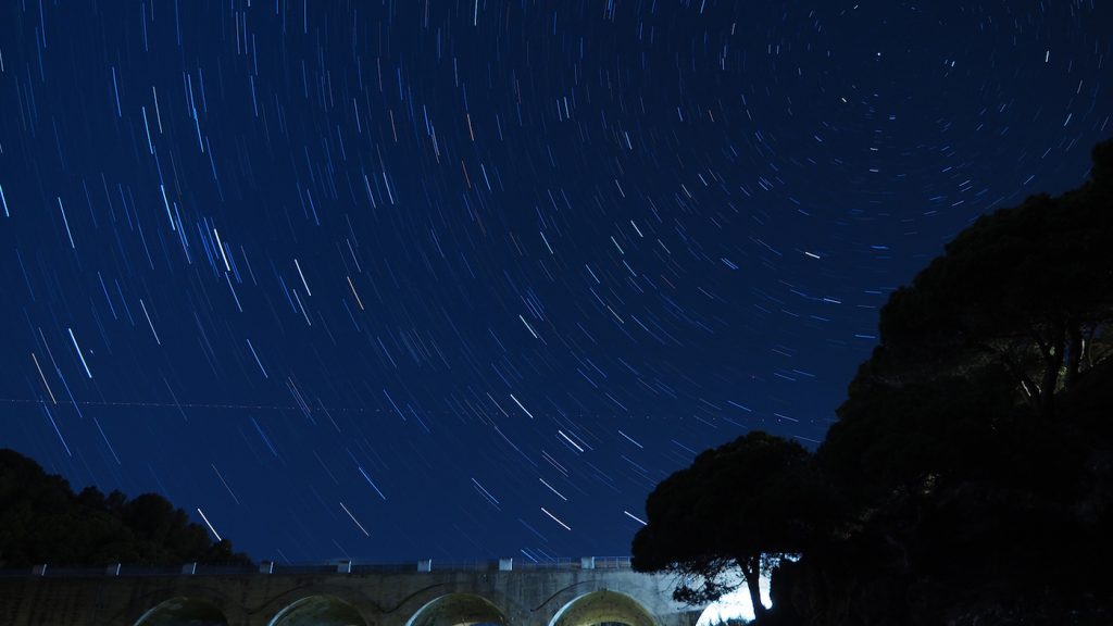 Imagen de rastro de estrellas tomada la noche del 15 de marzo de 2019, desde Calella, Barcelona, España. La imagen tiene un tiempo de exposición total de 15 minutos, 500 de ISO y f/4 de apertura. Se utilizó una cámara Olympus EM5II.