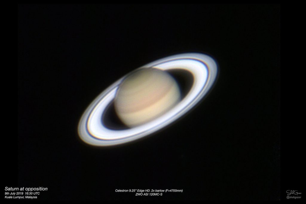 Excelente imagen de Saturno tomada durante la oposición con el Sol la noche del martes, 9 de julio de 2019, desde Kuala Lumpur, Malasia. Se utilizó una cámara ZWO ASI 120MC-S y un telescopio Celestron C9.25 (F=4700mm).