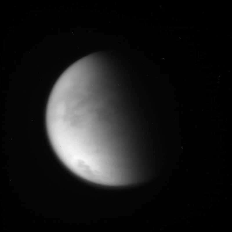 Esta imagen muestra a Titán, la luna más grande de Saturno. Fue captada por la sonda Cassini el martes, 18 de abril de 2017 (22:15 – UTC); la imagen fue recibida en la Tierra el 19 de abril a las 08:27 UTC. Se utilizaron los filtros CL1 y CB3 de la cámara de la sonda.