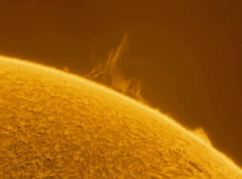 Prominencia solar captada en el limbo noroeste del Sol la mañana del viernes, 17 de mayo de 2019, desde la ciudad de Atenas, Grecia. Se utilizó una cámara DMK 31 y un telescopio solar Lunt LS100 (línea de emisión H-alfa).