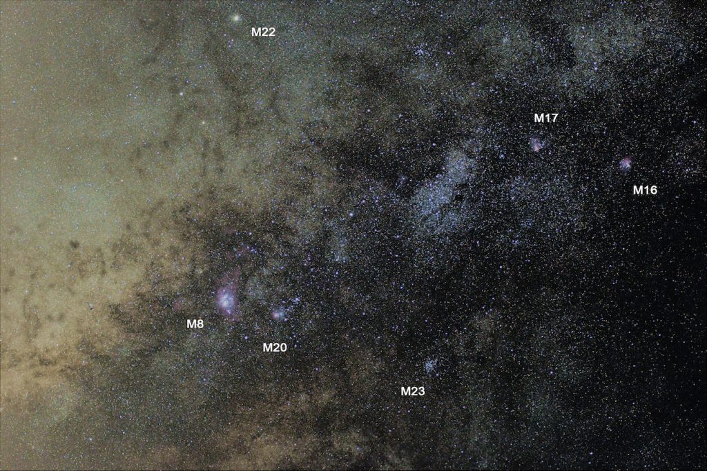 Imagen del Centro Galáctico tomada el sábado, 24 de agosto de 2019, desde Valdepeñas, Ciudad Real, España (00:14 UTC). La imagen está compuesta por 50 capturas apiladas, cada una de 16 segundos de tiempo de exposición y 4000 de ISO. Se utilizó una cámara Nikon D500 y un objetivo Simga (70-200mm).