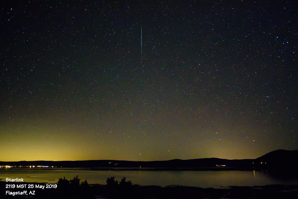 Estas imágenes muestran el paso de satélites Starlink sobre Flagstaff, Arizona, Estados Unidos, la noche del sábado, 25 de mayo de 2019. La primera imagen tiene 4 segundos de tiempo de exposición, 6400 de iSO, f/2,8 de apertura y 28mm de distancia focal. La segunda captura tiene 4 segundos de tiempo de exposición. Las dos fueron tomadas con una cámara Nikon D750.