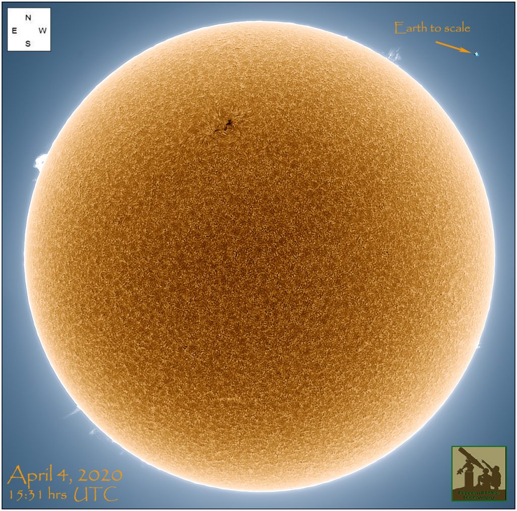 Imagen del Sol captada en la línea de emisión H-alfa la tarde del sábado, 4 de abril de 2020, desde el Observatorio Peppermill Skies en Huntington, Nueva York, Estados Unidos. La imagen fue captada con un telescopio Lunt LS80THa y una cámara Lumenera SKYnyx2-1.