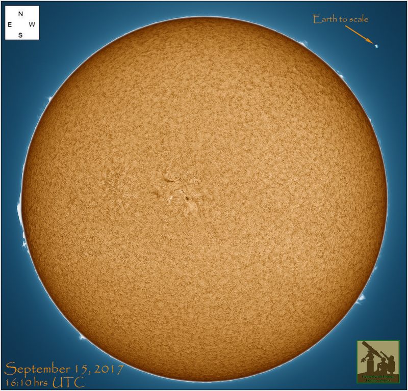 Imagen del Sol tomada en la línea de emisión H-alfa el 15 de septiembre de 2017. En el centro del disco se aprecia la región activa 2680 (la única región visible actualmente). La captura se obtuvo desde el Observatorio Peppermill Skies en Huntington (Nueva York, Estados Unidos). Se utilizó una cámara Lumenera SKYnyx2-1 y un telescopio solar Lunt LS80THa.C
