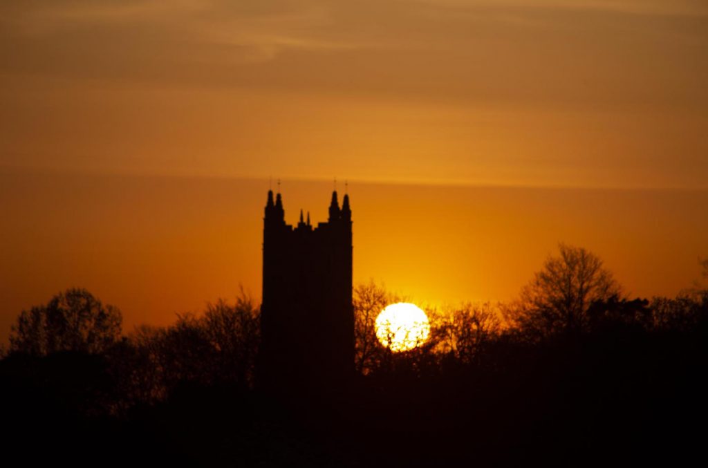 Imagen del Sol tomada al atardecer del martes, 23 de abril de 2019, desde Harleston (Norfolk, Inglaterra). A la izquierda del Sol se puede ver la iglesia de St. Mary en Redenhall. La foto tiene un tiempo de exposición de 1/500 de segundo, 100 de ISO y f/8 de apertura. Se utilizó una cámara Canon EOS 6D.