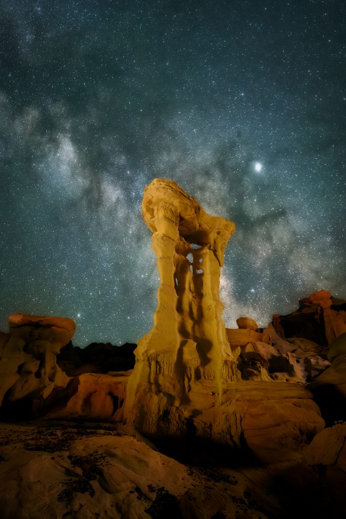 Espectacular imagen de la Vía Láctea tomada la madrugada del 7 de junio de 2019, desde el Valle de los Sueños en Tsaya, Nuevo México, Estados Unidos. En primer plano se puede ver el “trono alienígena”. La imagen tiene 20 segundos de tiempo de exposición y 400 de ISO; se utilizó una cámara Nikon D850 a 14mm de distancia focal y f/2,8 de apertura.