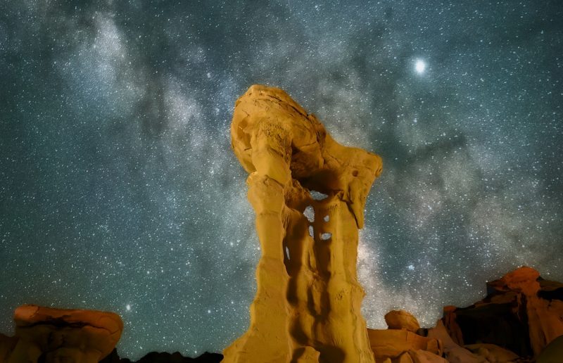 Espectacular imagen de la Vía Láctea tomada la madrugada del 7 de junio de 2019, desde el Valle de los Sueños en Tsaya, Nuevo México, Estados Unidos. En primer plano se puede ver el “trono alienígena”. La imagen tiene 20 segundos de tiempo de exposición y 400 de ISO; se utilizó una cámara Nikon D850 a 14mm de distancia focal y f/2,8 de apertura.