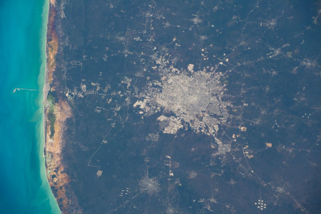Imagen tomada desde la Estación Espacial Internacional el 4 de febrero de 2021, a las 16:50 UTC. Se puede apreciar la ciudad de Mérida en el norte de la península de Yucatán, México. Se utilizó una cámara Nikon D5 a 240mm de distancia focal.