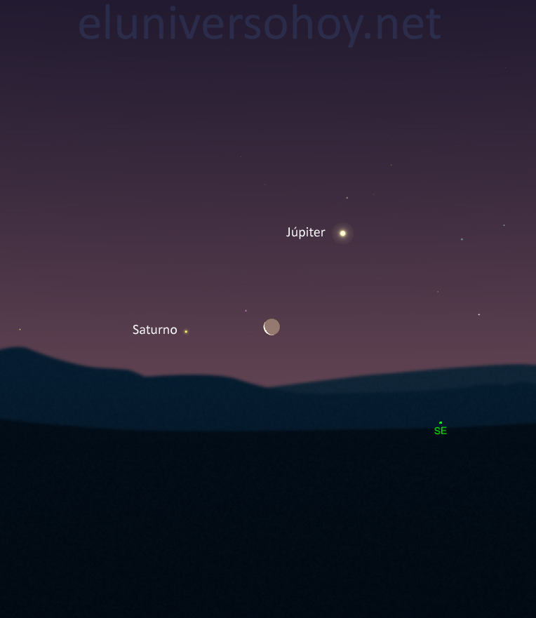 Este jueves, 20 de febrero de 2020, se podrá ver la conjunción de la Luna con los planetas Júpiter y Saturno en dirección Sureste, antes de la salida del Sol. Los dos objetos surgirán sobre el horizonte después de las 06:20 (hora peninsular). La máxima aproximación entre la Luna y Saturno se producirá a las 15:00 UTC. El evento se podrá observar a simple vista desde cualquier parte del mundo.