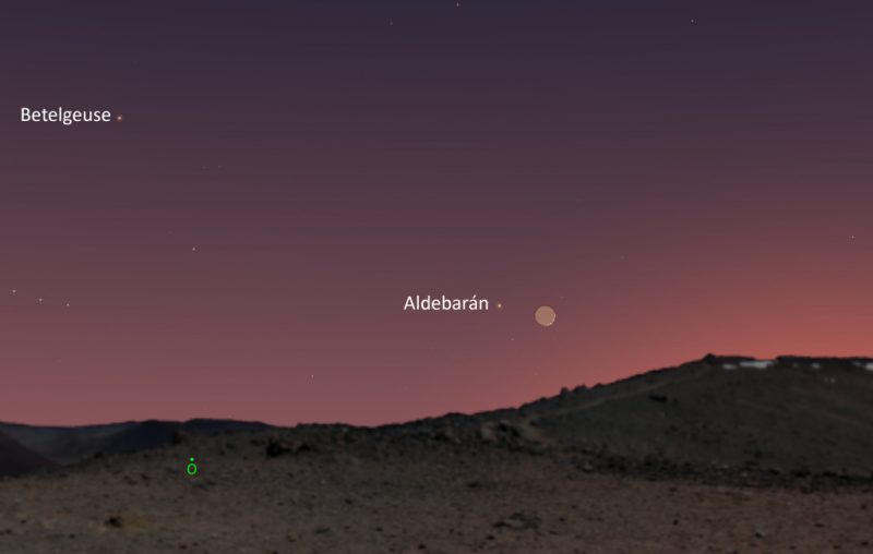 La conjunción de la Luna creciente y la estrella Aldebarán será visible este lunes, 6 de mayo de 2019, en dirección Oeste al anochecer. La máxima aproximación se producirá a las 22:00 UTC (magnitud de Aldebarán de +1,0). La conjunción se podrá observar desde cualquier país.