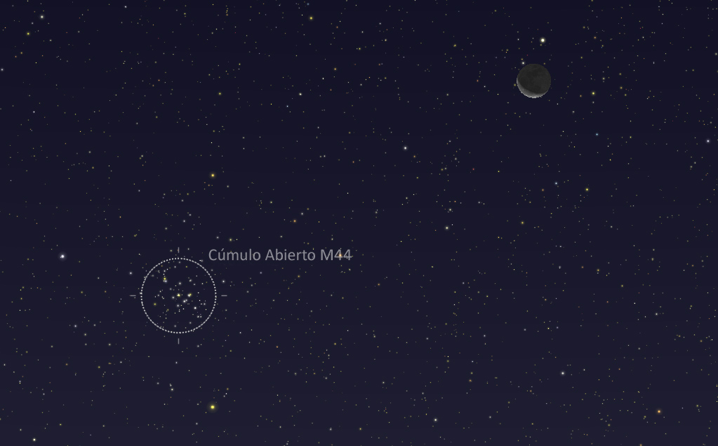 La conjunción del Cúmulo Abierto M44 y la Luna será visible antes del amanecer del sábado, 16 de septiembre de 2017. Los dos objetos comienzan a ser visibles en dirección Este 3 horas y 40 minutos antes de la salida del Sol. El máximo acercamiento se producirá a las 15:00 UTC. Para observar al cúmulo M44 se recomienda utilizar prismáticos o telescopio. La conjunción se podrá ver desde cualquier país.