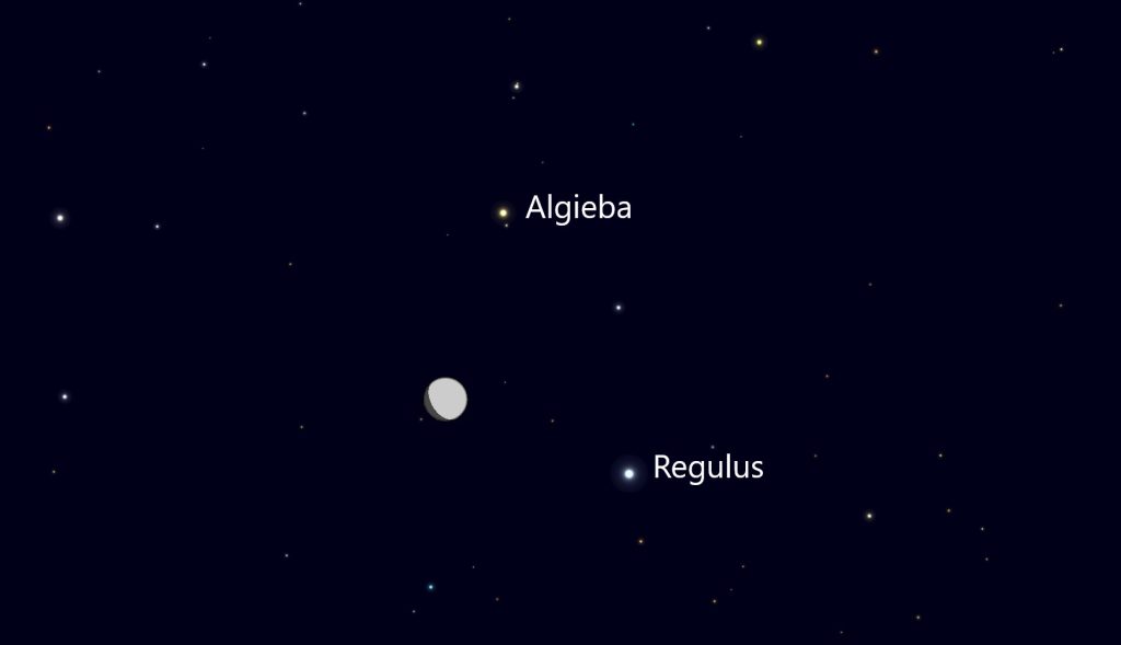 La conjunción de la Luna y la estrella Regulus será visible el martes, 12 de abril de 2024, comenzando al anochecer en dirección Sur. La aproximación máxima entre los dos objetos se producirá a las 15:00 UTC. El evento podrá ser observado a simple vista desde cualquier parte del mundo.