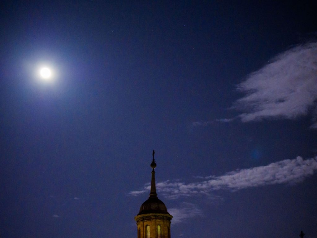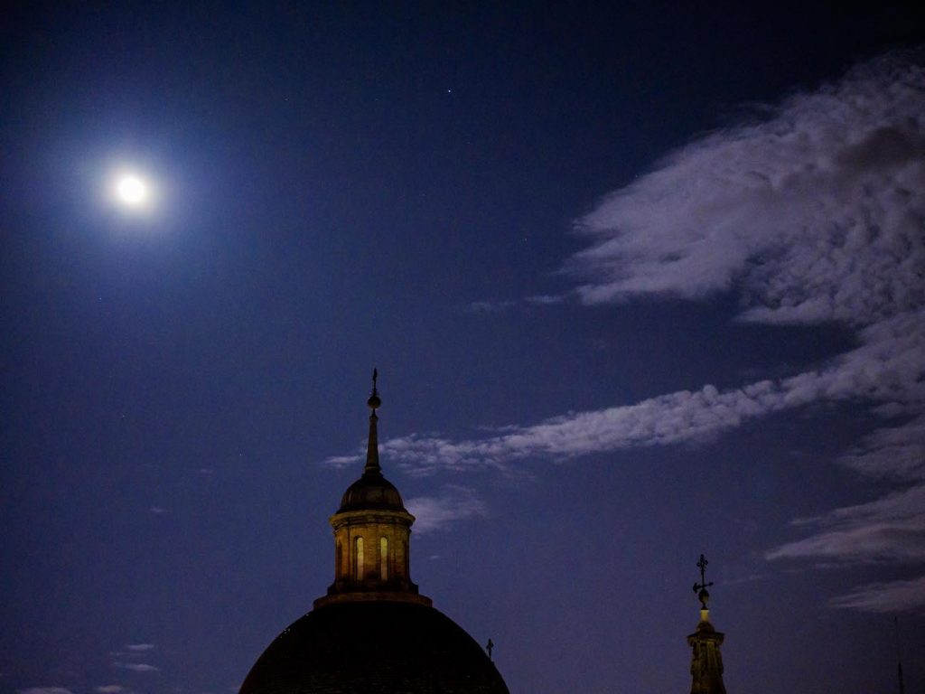 Estas tres fotografías fueron tomadas la noche del miércoles, 8 de abril de 2020, desde la ciudad de Zaragoza, España. En la zona superior se puede ver a la Luna en conjunción con la estrella Spica. En la zona inferior se aprecia la cúpula de la Iglesia de San Fernando.