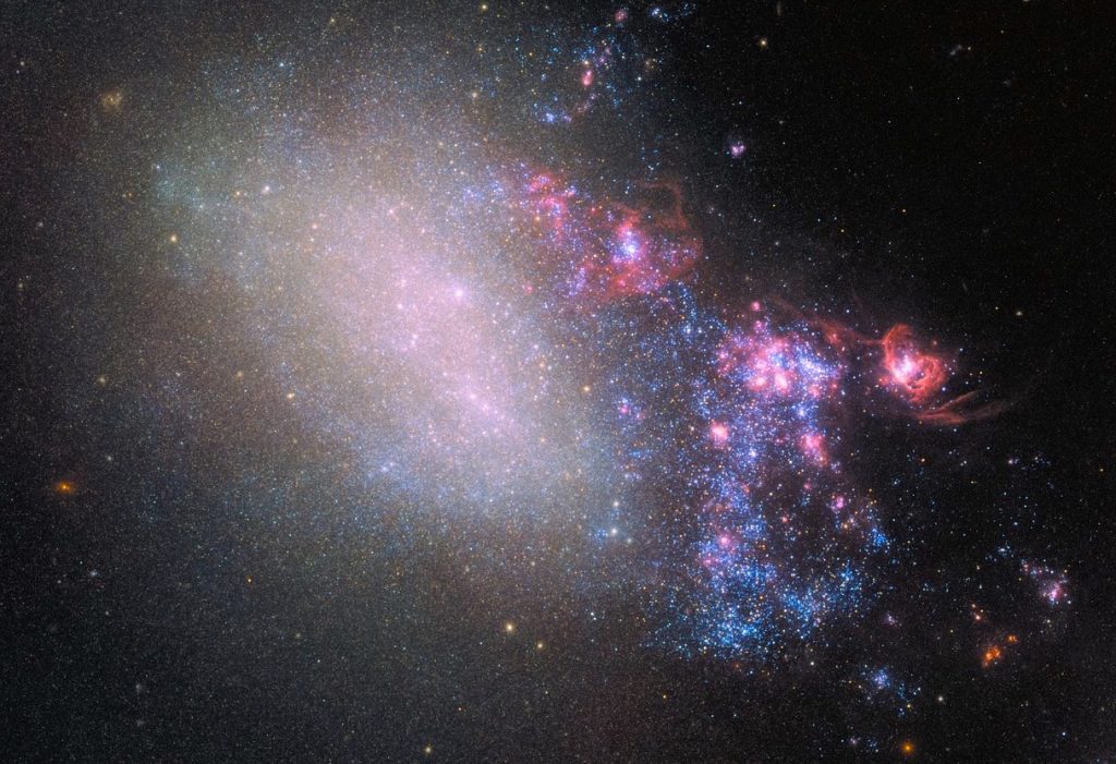 NGC 4485 ahora está divida en dos regiones muy diferentes: del lado izquierdo quedan los remanentes de la estructura espiral de la galaxia; mientras que en el lado derecho se puede ver todo el material que fue arrancado durante la colisión.