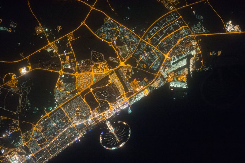 Fotografía tomada desde la Estación Espacial Internacional el 8 de abril de 2017 a las 19:17 UTC. En la zona inferior se puede ver a la isla artificial conocida como Palm Jumeirah, la cual es la más pequeña del grupo de tres islas artificiales conocidas como “Islas Palm”. Al momento de tomarse la imagen, la Estación Espacial Internacional se encontraba ubicada sobre el noroeste de Omán.