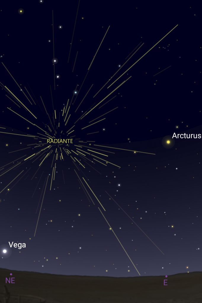 Esta imagen muestra la ubicación del radiante de las Cuadrántidas a las 03:00 (hora peninsular) del lunes, 3 de enero de 2022, en dirección Nordeste.