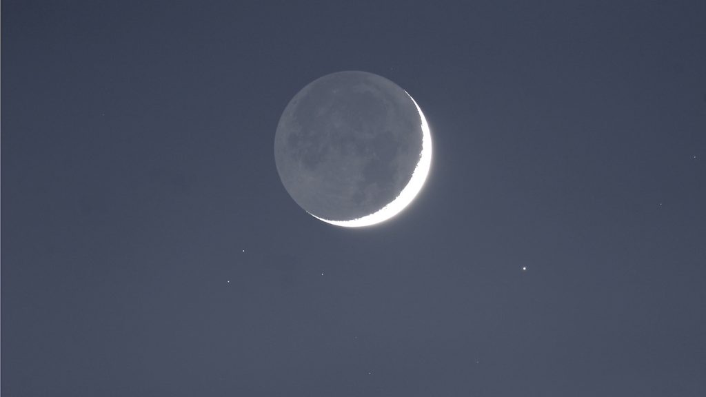 Fotografía de la Luna creciente captada al atardecer del viernes, 28 de abril de 2017, desde Emmerich am Rhein, Alemania. Abajo y a la derecha de la Luna se puede ver a la estrella Aldebarán. La captura tiene 5 segundos de tiempo de exposición y 100 de ISO. Se utilizó una cámara Canon EOS 100D.