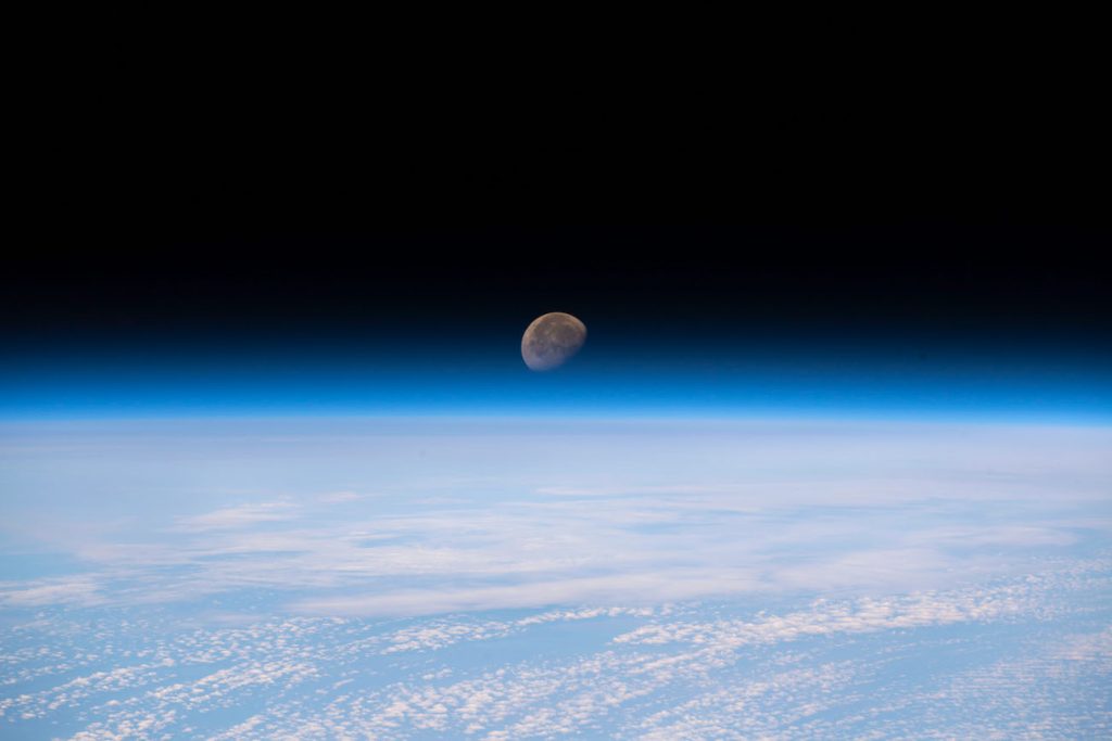 Imagen de la Luna gibosa menguante fotografiada desde la Estación Espacial Internacional el 20 de agosto de 2019, a las 17:56 UTC. Se utilizó una cámara Nikon D5 a 240mm de distancia focal. Al momento de tomarse la imagen, la ISS se encontraba ubicada sobre la región central de la provincia de Ontario, Canadá.
