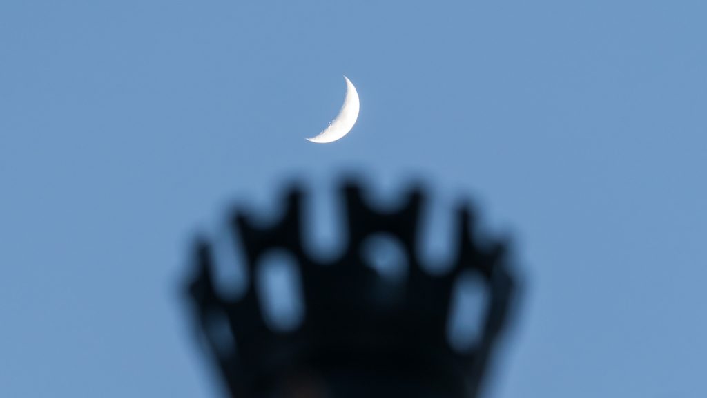 Estas imágenes muestran a la Luna sobre una farola junto a la torre de la Iglesia de San Antonio de Padua, en la ciudad de Zaragoza (España). La Luna alcanzará la fase Cuarto Creciente el próximo 14 de enero. Las dos imágenes fueron tomadas la tarde del viernes, 11 de enero de 2019.