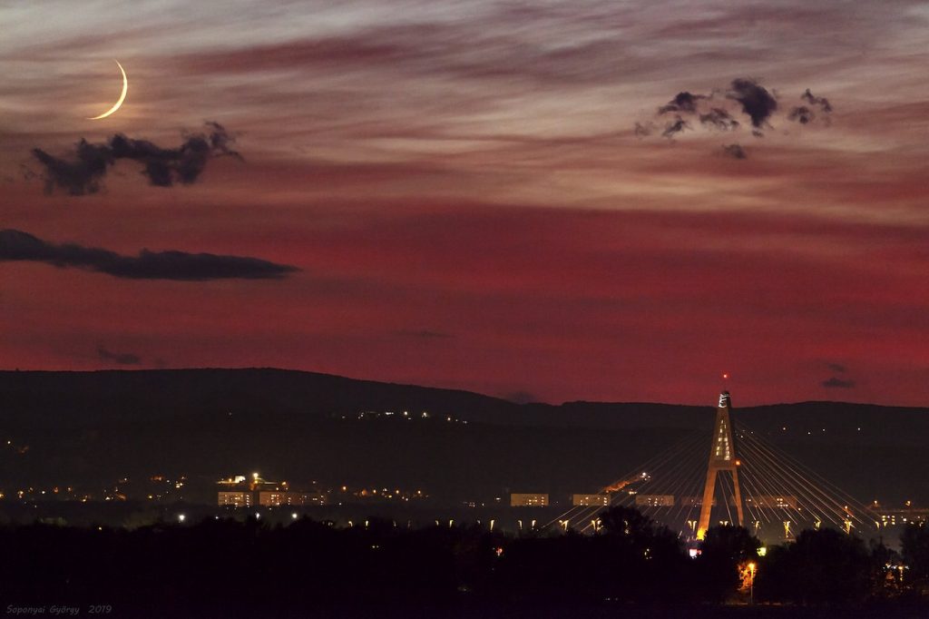 Excelente imagen de la Luna creciente captada sobre la ciudad de Budapest, Hungría, al anochecer del 30 de septiembre de 2019. En la zona inferior-derecha se puede ver uno de los pilares del Puente Megyeri.