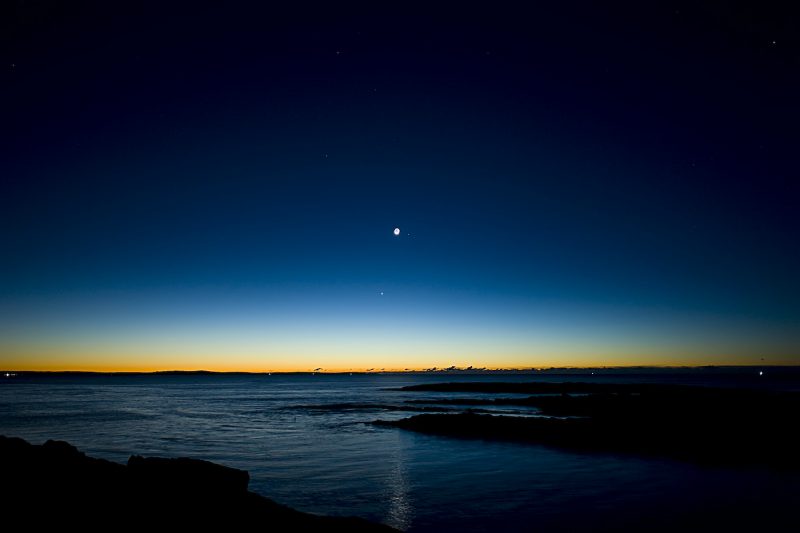 Fotografía tomada al amanecer del martes, 17 de octubre de 2017, desde la isla Baileys en Maine, Estados Unidos. En el centro se puede ver a la Luna y Marte; el planeta Venus está ubicado en la zona inferior. La captura tiene 1250 de ISO y un segundo de tiempo de exposición; se usó una cámara Nikon D700.