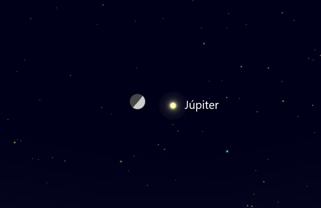 La Luna y el planeta Júpiter estarán en conjunción el jueves, 29 de diciembre de 2022, comenzando al anochecer en dirección Sur. Los dos objetos alcanzarán su aproximación máxima a las 13:00 UTC. El evento se podrá a observar a simple vista desde cualquier parte del mundo.