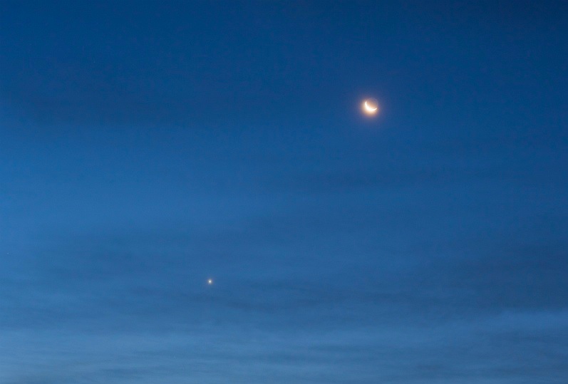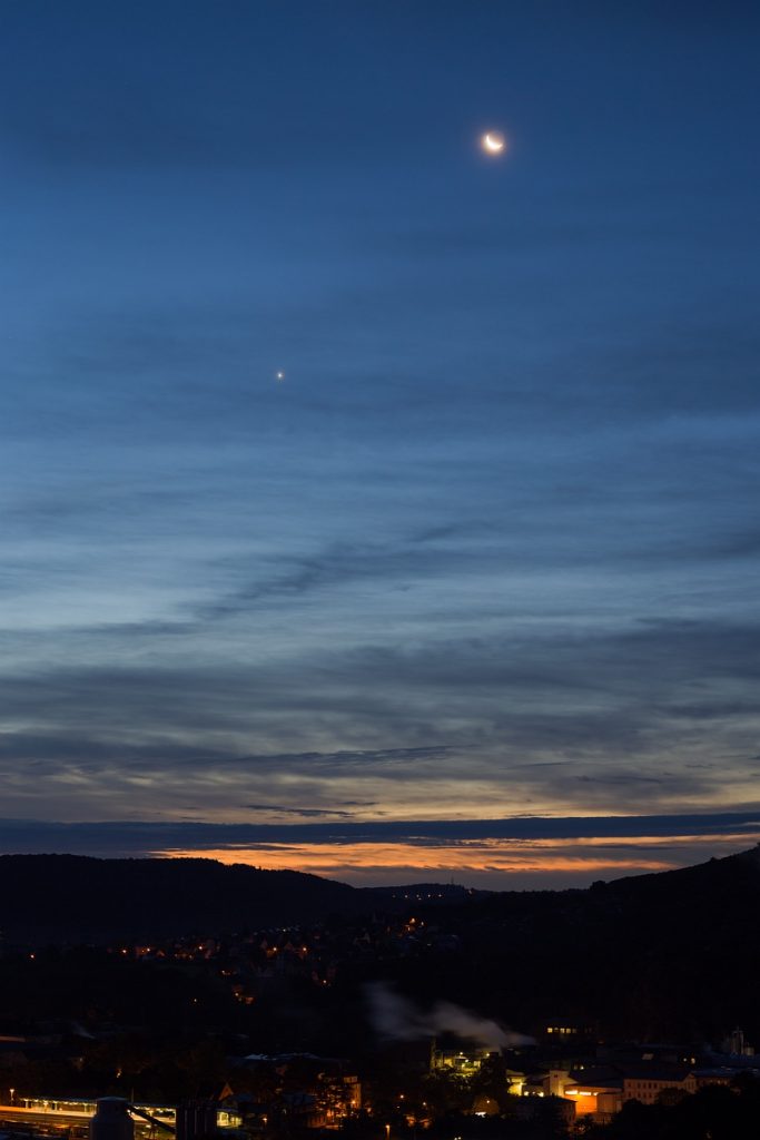 Fotografía de la Luna menguante y Venus tomada al amanecer del domingo, 17 de septiembre de 2017, desde Freital (Sajonia, Alemania). La Luna y Venus estarán en conjunción la madrugada del 18 de septiembre. Esta foto fue tomada con una cámara Canon EOS 500D; tiene 3,2 segundos de tiempo de exposición y 200 de ISO.